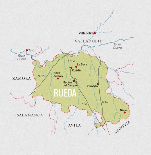 La D. O. Rueda se sitúa en el sector central de la depresión que forma el río Duero, constituyendo una altiplanicie de suaves relieves y vertientes sometidas a los vientos atlánticos. Amplias terrazas aluviales y dilúviales en los márgenes del Duero y de sus afluentes Trabancos, Zapardiel y Adaja.