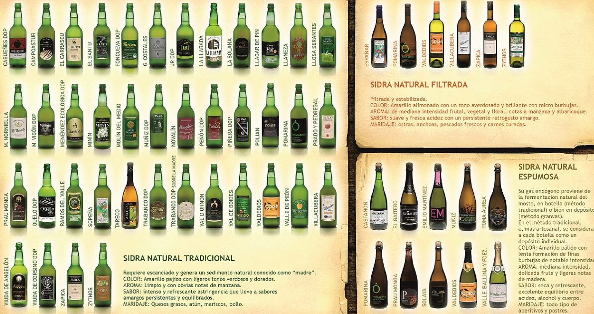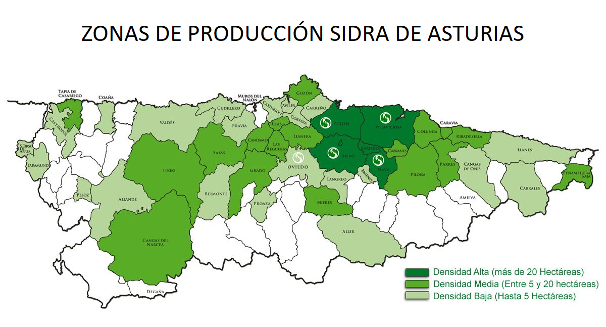 La producción de sidra es una de las actividades agroindustriales más importantes de Asturias con 948 hectáreas de pumaradas plantadas y 45 millones de litros producidos cada año. Amparado a la D.O.P. Sidra de Asturias se producen 3 tipos de sidra: Sidra Natural Tradicional (se produce a partir del jugo de la manzana fermentado, no se filtra y requiere ser escanciada), Sidra Natural Nueva Expresión (se produce a partir del jugo de la manzana fermentado, se filtra y se estabiliza), y Sidra Natural Espumosa (se hace una segunda fermentación en recipiente cerrado y así tiene el carbono endógeno, que no es añadido).