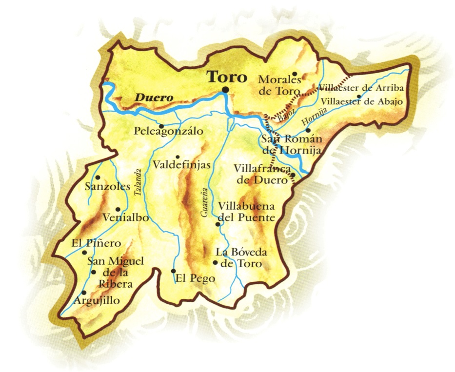 La zona de producción de los vinos de D.O. Toro se encuentra situada al sureste de la provincia de Zamora y suroeste de la provincia de Valladolid. Comprende parte de las comarcas naturales de Tierra del Vino, Valle del Guareña y Tierra de Toro y linda con los páramos de Tierra del Pan y Tierra de Campos.